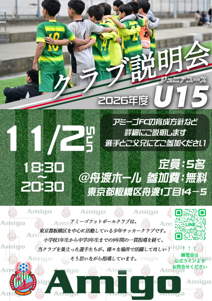 この度、2026年度新中学1年生対象のジュニアユースクラブ説明会を開催いたします。